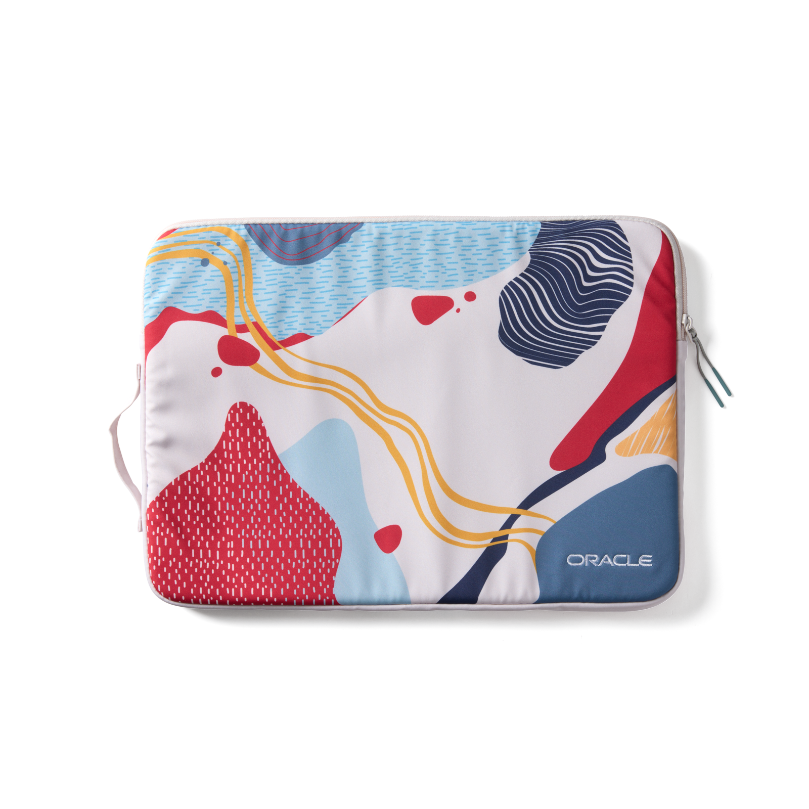 This colorful laptop sleeve features a modern all-over design with a padded interior to protect your device while on the go. It includes a secure zipper closure and a convenient side handle offering both style and function.