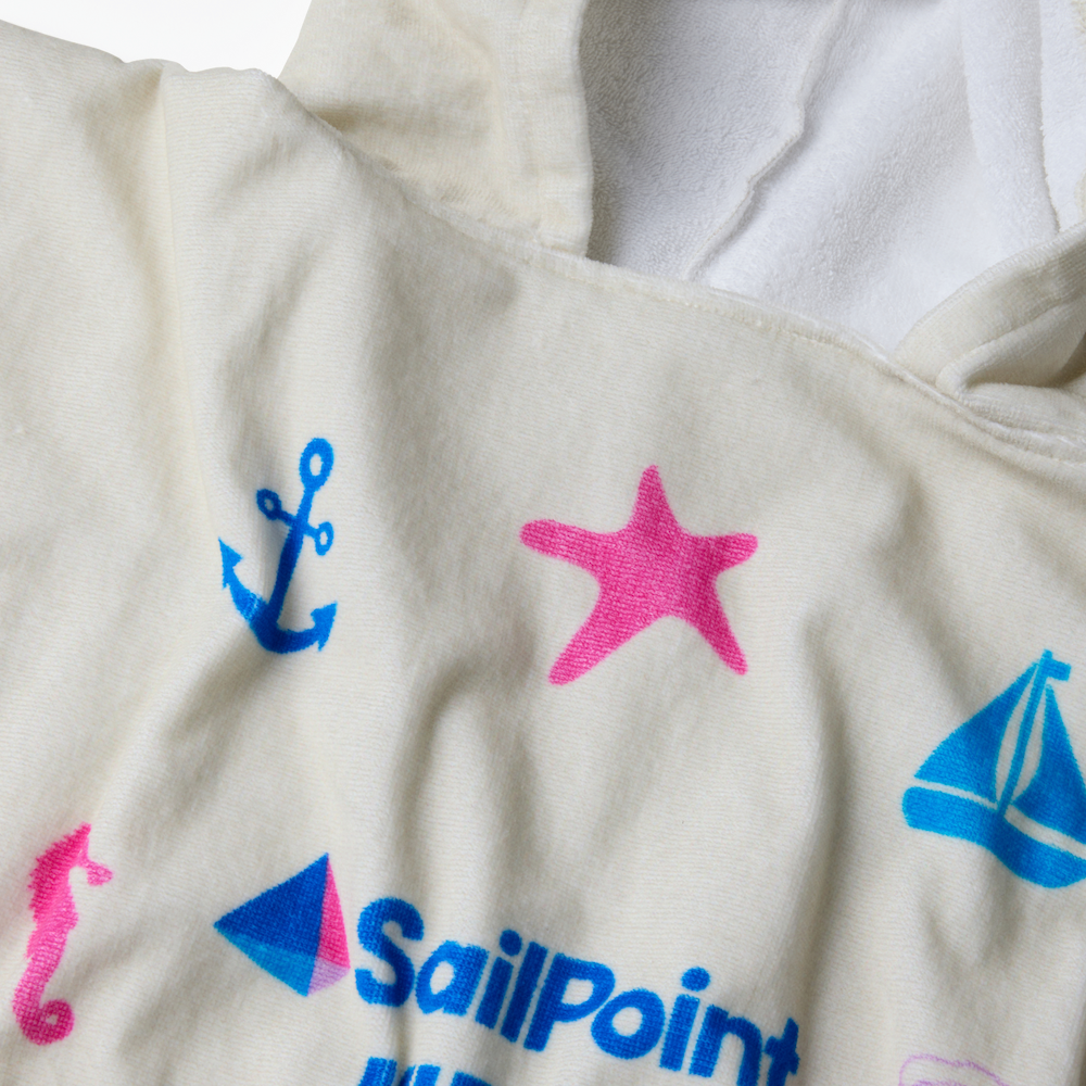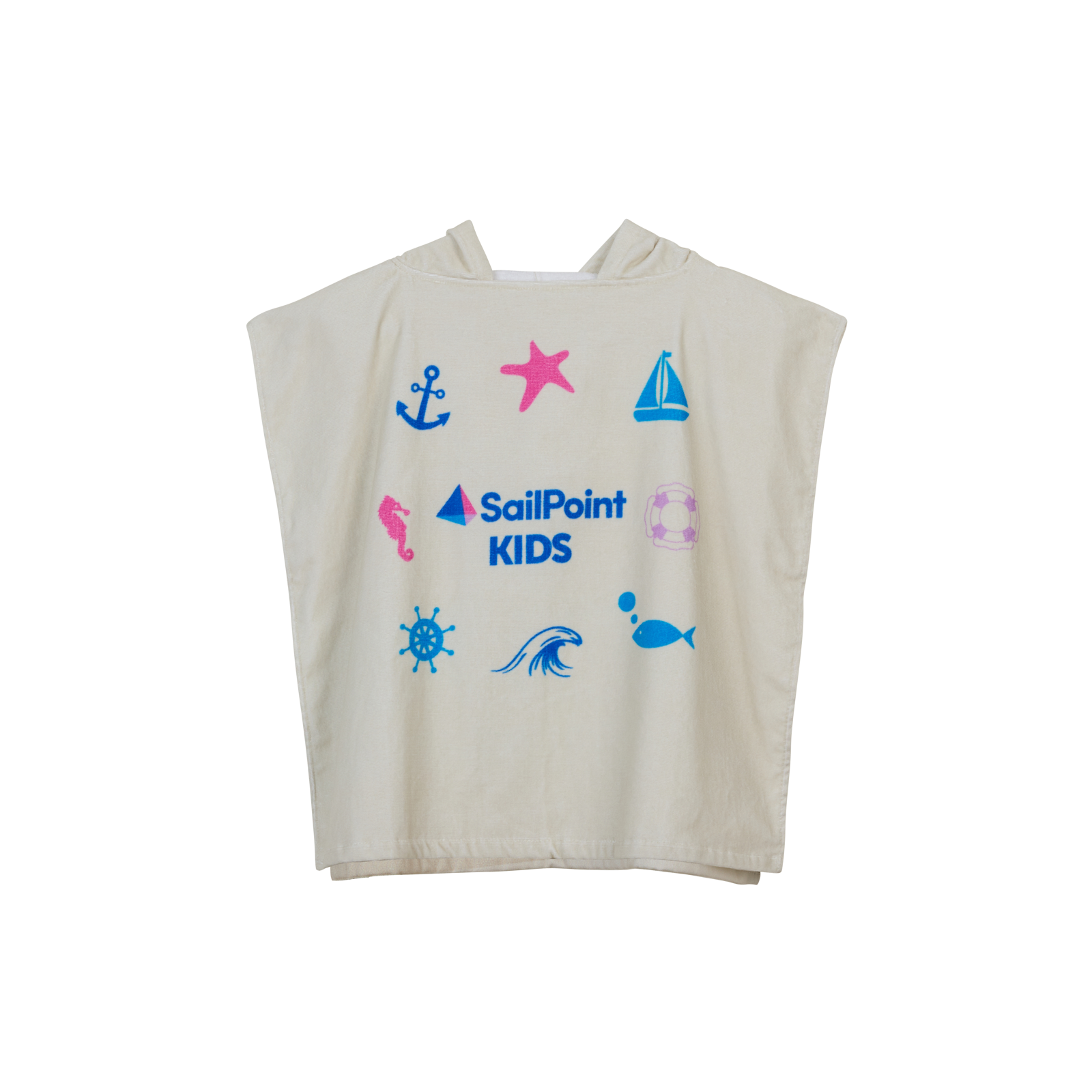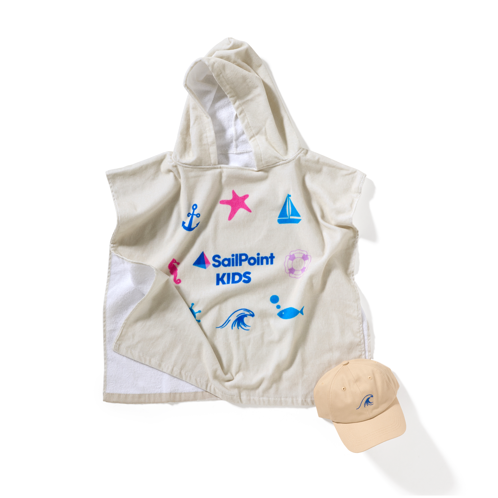 The Sailpoint kids kit is perfect for summer camp! Featuring a soft poncho-style towel and a matching cotton cap. Both pieces are adorned with playful nautical graphics perfect for sunny adventures by the sea or pool.
