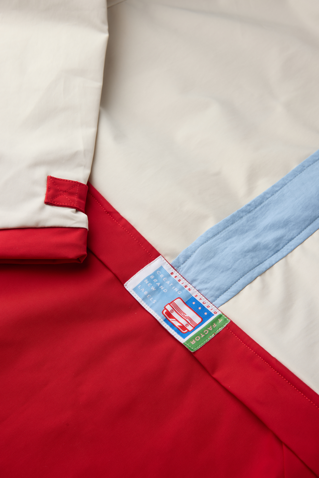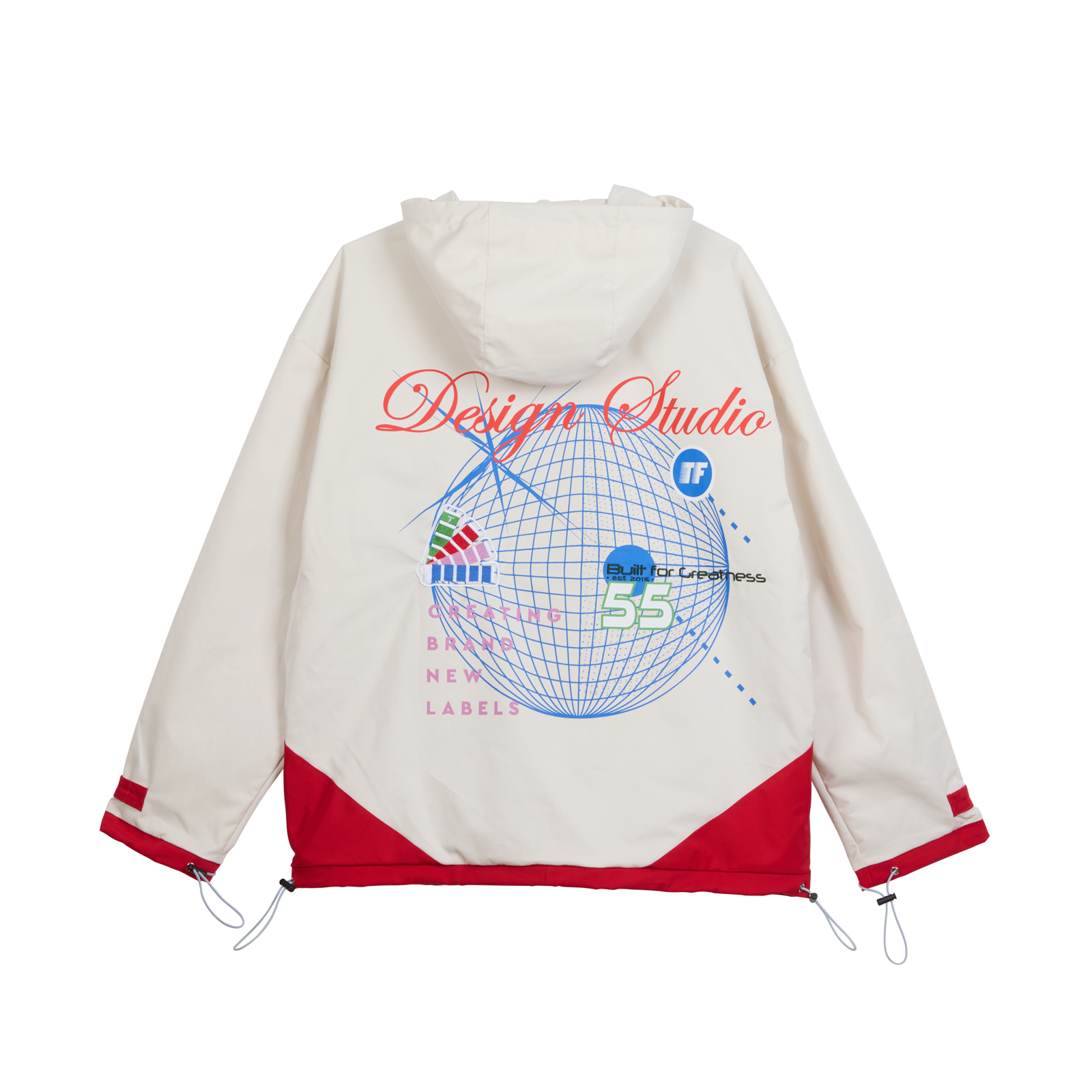 A bold, lightweight windbreaker designed with a colorblock palette of cream, red, and sky blue. Featuring a roomy hood, adjustable details, and functional front pocket, it blends streetwear energy with practical comfort. Branded graphic prints and embroidered patches add a creative finish, making it perfect for layering on breezy days.